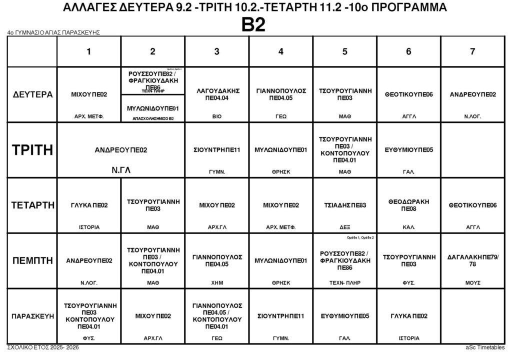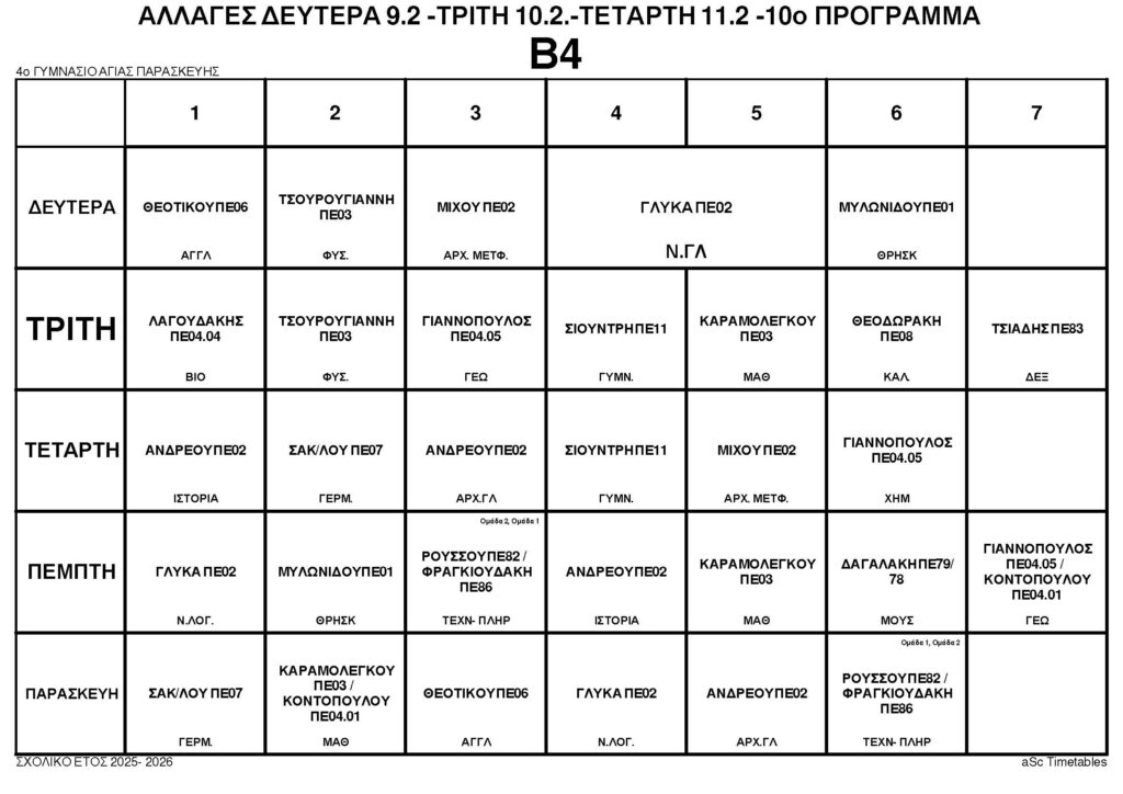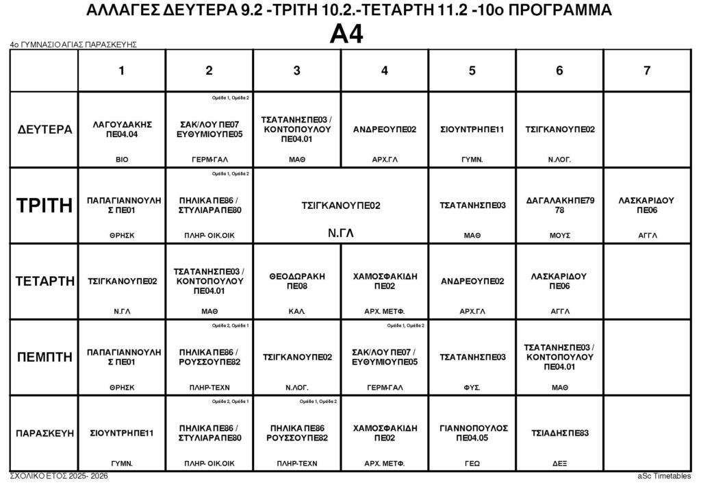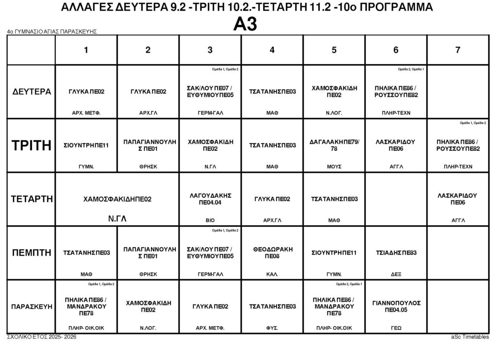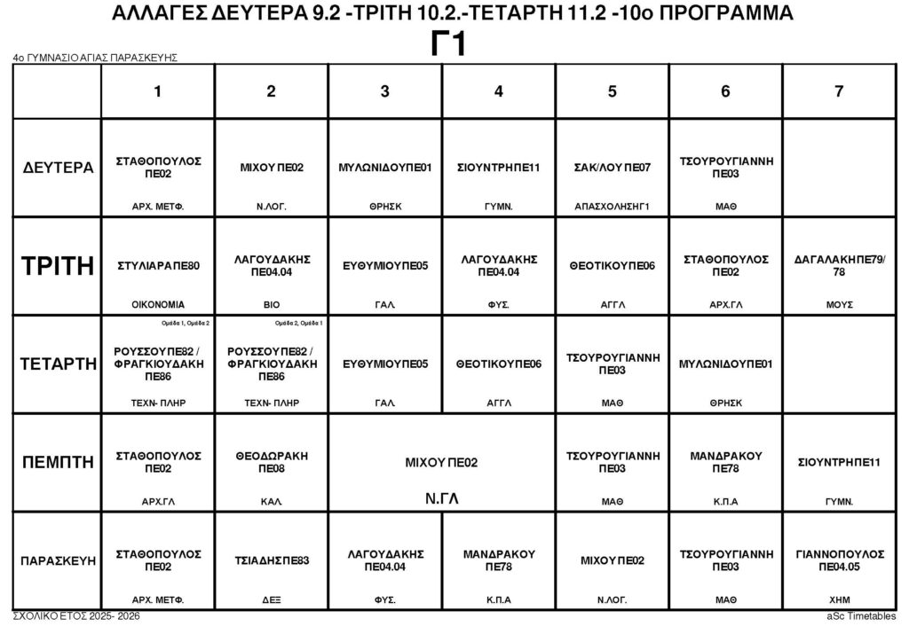 Πρόγραμμα μαθημάτων με αλλαγές από 9/2-13/2/2026