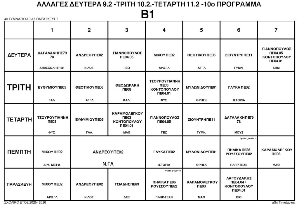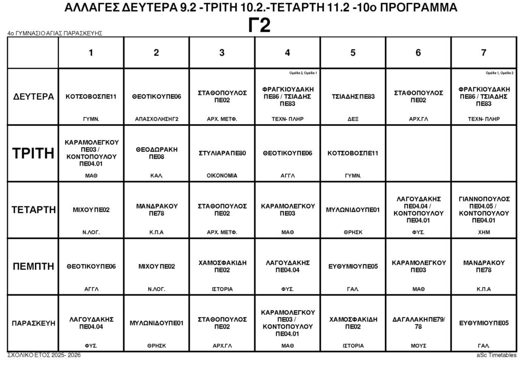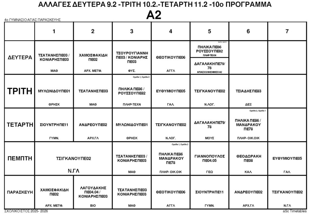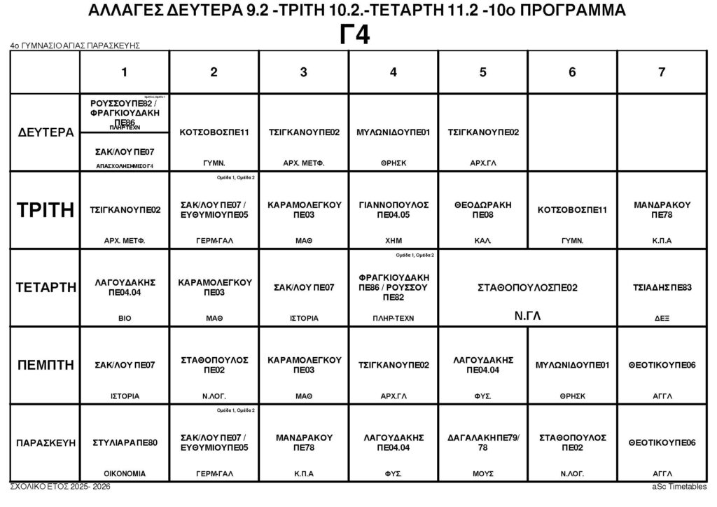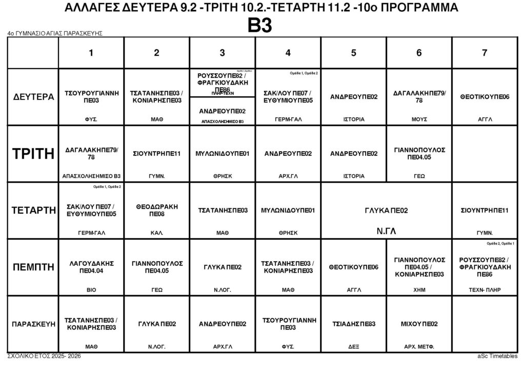 Πρόγραμμα μαθημάτων με αλλαγές από 9/2-13/2/2026
