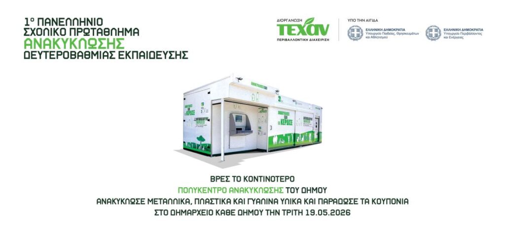 Πήγαινε στο κοντινότερο πολυκέντρο ανακύκλωσης του δήμου μας, ανακύκλωσε μεταλλικά, πλαστικά και γυάλινα υλικά μέχρι τις 15 Μαΐου  2026 και παράδωσε τα κουπόνια στο δημαρχείο την Τρίτη 19/05/2026.